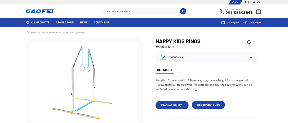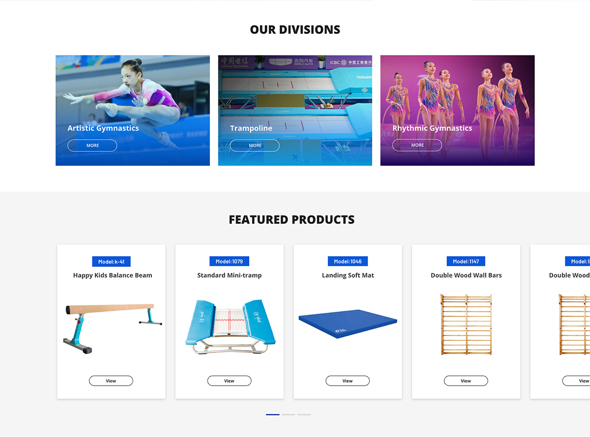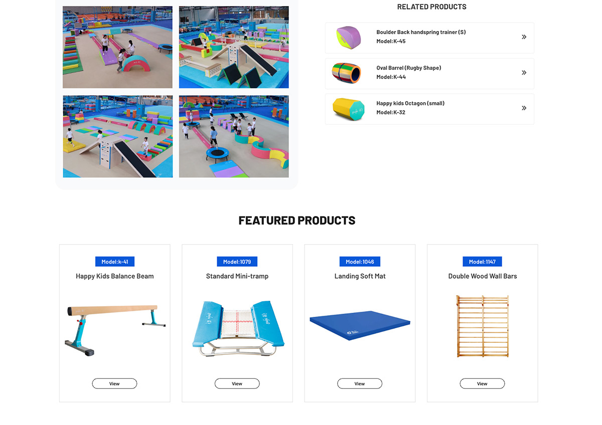 產(chǎn)品展示邏輯:產(chǎn)品分類清晰,通過圖文結(jié)合方式展示體育器材參數(shù)與應(yīng)用場(chǎng)景,便于海外采購商快速獲取關(guān)鍵信息。